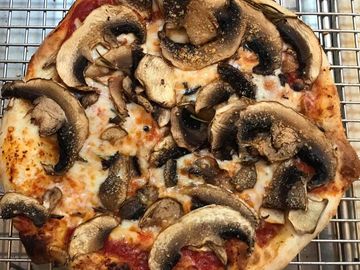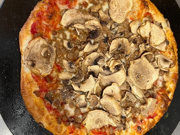 Pizza sauce, mozzarella, hamburger, Romano cheese & mushrooms