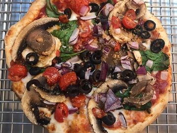 Pizza sauce, mozzarella, black olives, tomatoes, spinach, onion & mushroom